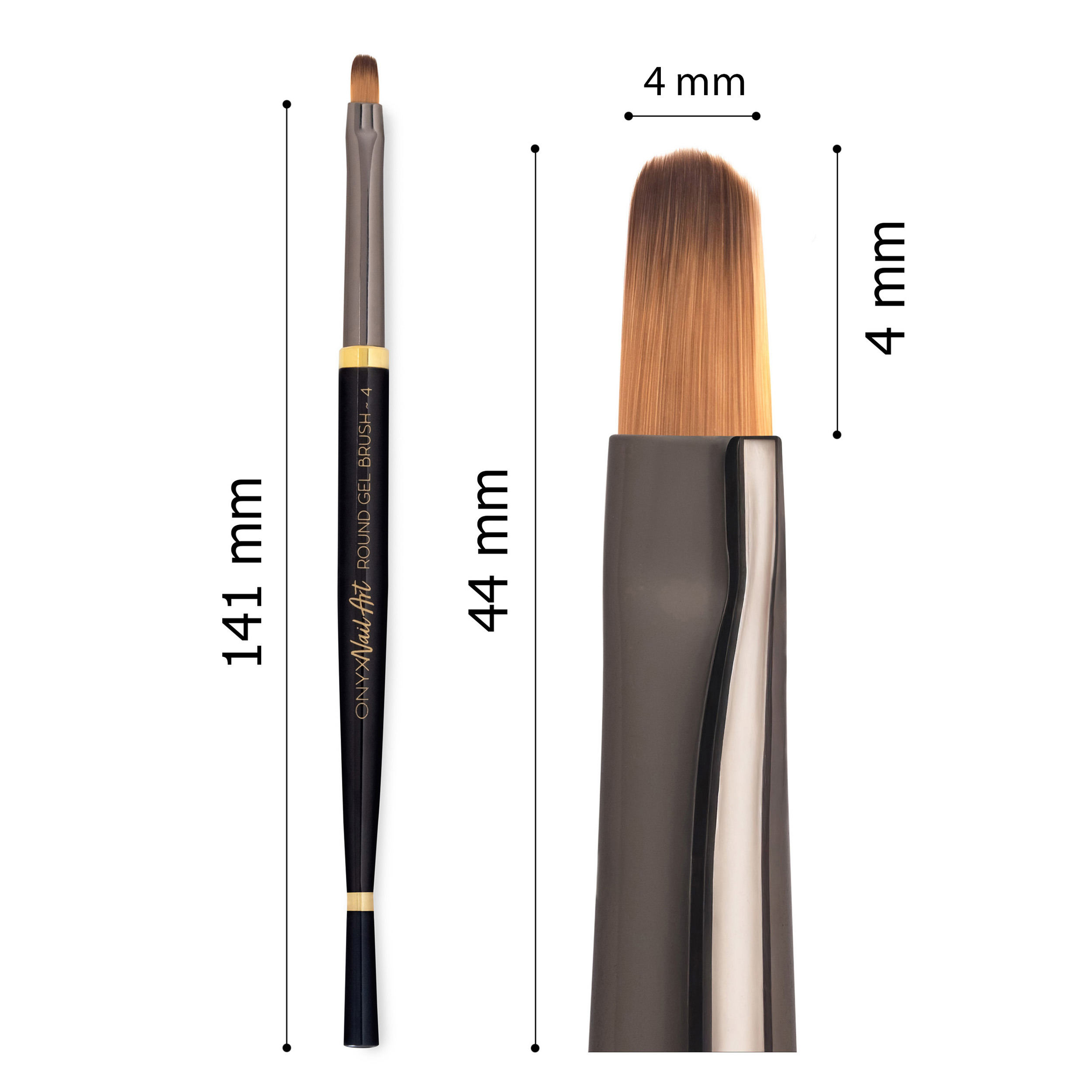 Model ONYX Round 4 vyniká zúženou, zaoblenou špičkou, která se dokonale přizpůsobí přirozené linii nehtového záhybu. Použití vysoce kvalitních syntetických štětin zaručuje dokonalou elasticitu a umožňuje hladkou aplikaci bez pruhů nebo vzduchových bublin.