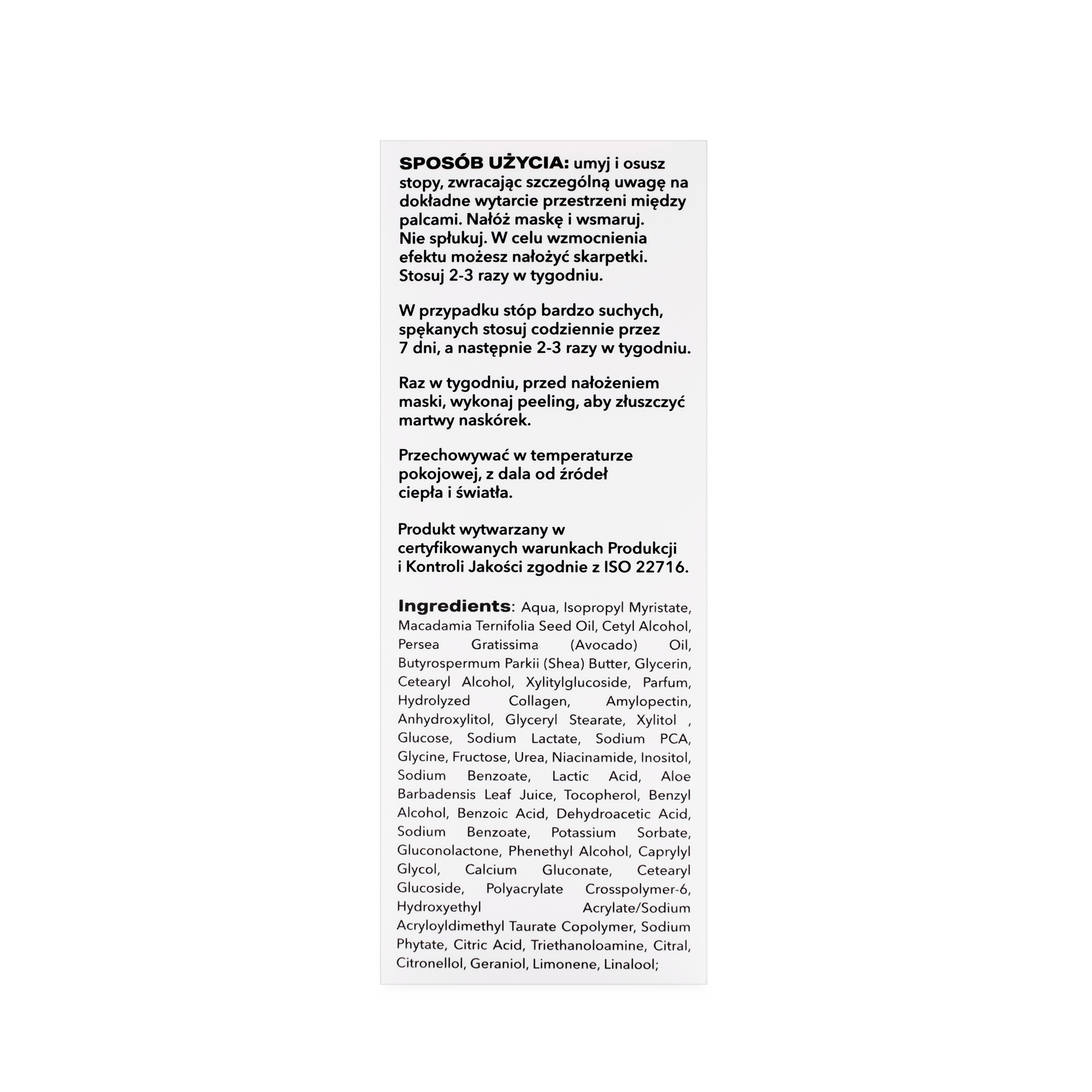 Špecializovaná maska PodoIntensive na ruky a nohy je výsledkom dlhoročnej práce a spoločných skúseností našich odborníkov. Jej vytvorenie bolo inšpirované potrebou vytvoriť nový výrobok na komplexnú starostlivosť o pokožku. Zabraňuje tvorbe mozoľov a prasklín. Regeneruje a podporuje obnovu epidermy. Jednou z hlavných účinných látok obsiahnutých v maske je prášok z orechov babassu, ktorý znižuje potenie nôh a poskytuje zmatňujúci účinok, takže maska nezanecháva na pokožke mastný film.